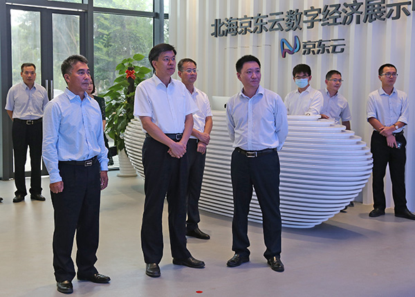 2020年6月11日下午,北海市委書記王乃學同欽州市委書記許永錁所率領的欽州市黨政代表團到中國電子北部灣信息港調研,參觀了北海京東云數(shù)字經(jīng)濟展示中心、京東網(wǎng)紅直播基地,聽取企業(yè)負責人介紹生產經(jīng)營等方面的情況。